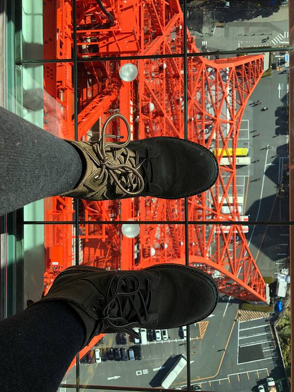 不同于上海的东方明珠,脚底下全是玻璃。东京塔是间隔一段距离,有一块长方形的玻璃,可以欣赏脚下的风景,感受悬空。场内还有放映区域,可以观看。