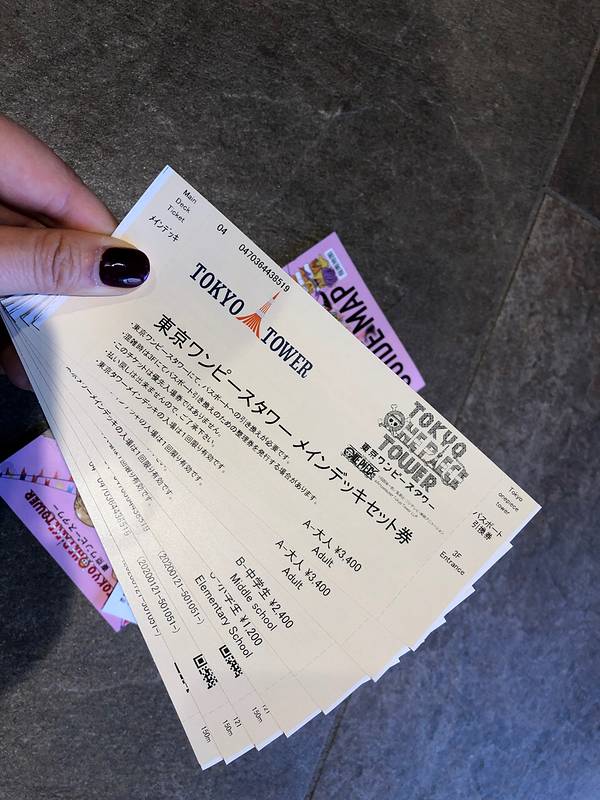 【开放时间&门票】东京塔开放时间为每天早上9点到晚上10点,门票分为几档,只去150m观景台是900烟,去150m和250m两层观景台是1600烟,还有塔内还有海贼王的特别展,貌似套票是3000烟。