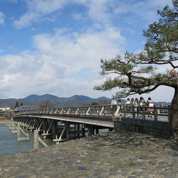 渡月桥别名岚桥,横跨在京都岚山的大堰川上,全长155米,据说是空海的弟子道昌于日本平安时代初期的836年(日本承和三年)整修大堰川时所建。秋季时,在红叶陪衬下的这座桥融入岚山景致,成为代表京都的明媚景色。 以桥为分界,上流称为大堰川,下流则称桂川,是昔日平安都城的贵族们乘舟戏水、欣赏枫叶的热门景点,细致优雅的水流至今不断。此外,享誉全日本、流传千年的捕鱼技巧“鹈饲捕鱼”也在该桥附近举行,是每年7月至9月中旬的热门表演。在桥上还可赏岚山四季美景。