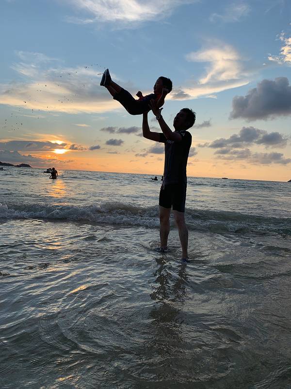 尾巴从小就去亲子游泳,一直教的都是要跳...在普吉岛的最后一晚上,在酒店游泳池游了一下,再去海边玩了一会,海滩水其实很干净,就是没有离岛的蓝,海滩也没有离岛的白,人不多,但是已经比国内大部分海好多了!