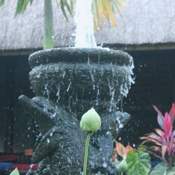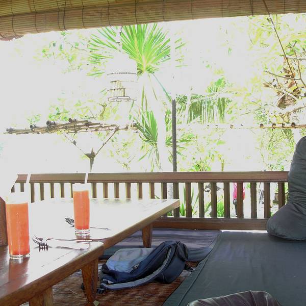 这里有一片稻田,用餐的露天卡座也很有特色,是需要脱了鞋盘坐的榻榻米风格,典型的巴厘岛建筑。就餐的时候可以享受这里的田园风光。鉴于我们中午刚吃完乳猪饭不久。我们就没有在这里就餐。只是点了些果汁。