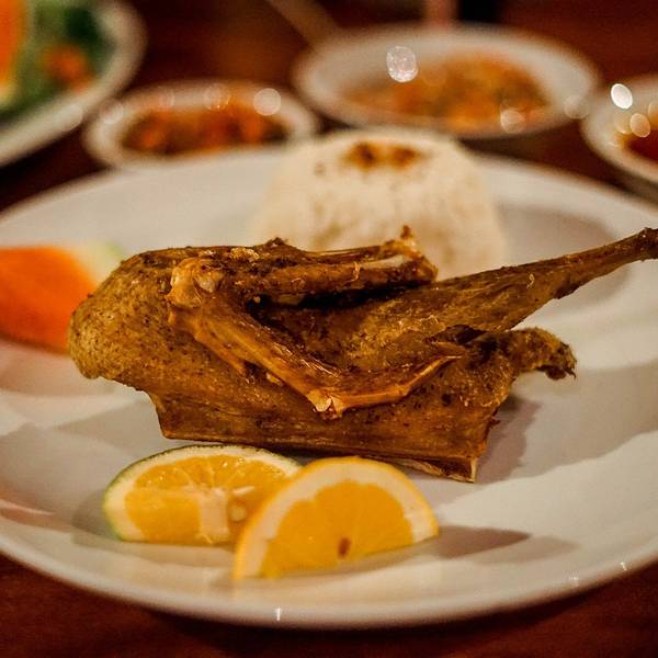 脏鸭餐可以说是一道每位到巴厘岛旅游的游客必要品尝的特色餐,人们对脏鸭餐是众说不一。有的说,到巴厘岛不吃脏鸭餐,等于没有到巴厘岛;也有的说脏鸭餐没有想象中的好吃,褒贬不一。全巴厘岛以乌布的脏鸭餐最出名,因为这里被大片大片的稻田环绕,水质好,鱼虫多,鸭子长得肥美。