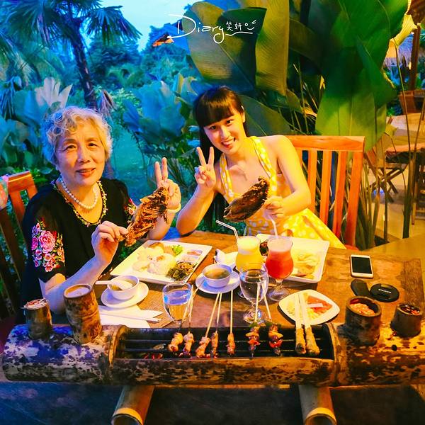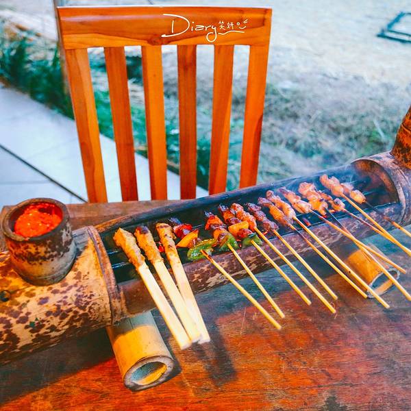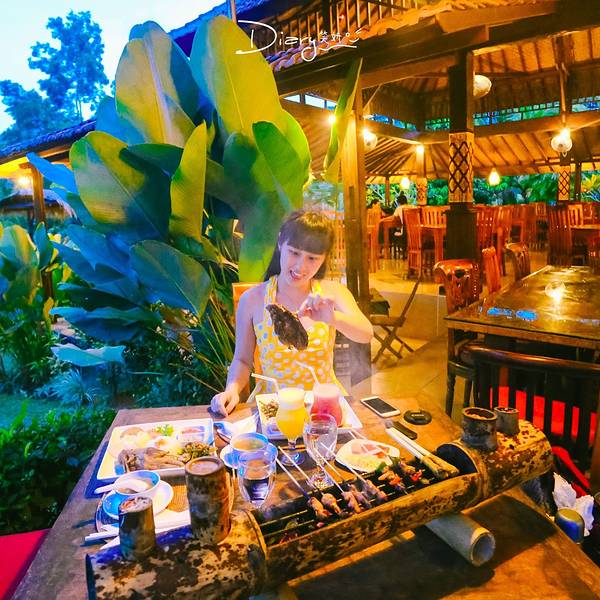 其实我们这一天的下一站,并不是打卡什么景点!而是直接从午餐跨越到了吃晚餐哈哈哈!我们一路驱车从东海岸来到了乌布,直接开往今天的晚餐——脏鸭餐厅~特色脏鸭是巴厘岛有名的美食,餐厅一般大多建在稻田中,...其实我们这一天的下一站,并不是打卡什么景点!而是直接从午餐跨越到了吃晚餐哈哈哈!我们一路驱车从东海岸来到了乌布,直接开往今天的晚餐——脏鸭餐厅~特色脏鸭是巴厘岛有名的美食,餐厅一般大多建在稻田中,我们到达餐厅的时候还早,于是决定先来稻田中拍拍照~别看稻田出片很美,拍照的过程可是着实受罪!我和外婆满腿被咬的红疹子不说,时不时还会跌入看不见的泥坑!差点把单反都给摔了阿呜!不过还是感谢外婆陪我在稻田里折腾,才有了这组风吹麦浪的臭美照,圆了我的小小心愿嘻嘻~巴厘岛的天色暗下来的很快,我和外婆决定圆满收工,回餐厅吃饭饭咯!前菜的汤喝完之后,服务员端了一个炭烤的竹炉上来,烧烤架上是各色各样的爪哇风味烤串儿!作为一个肉食动物+烧烤狂热爱好者,我真是好激动!!烧烤之后便是今天的重头戏——脏鸭!