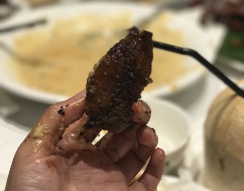 一家四口来的,带了一中一小两个娃,主菜按店员推荐的量点了两只螃蟹(黑椒蟹和奶油蟹)! 前菜是香茅烤串,牛肉烤的非常嫩,入口即化,带上香茅的香味,配上秘制酱汁(里面还有小花生碎),一人一串刚刚好,然后...