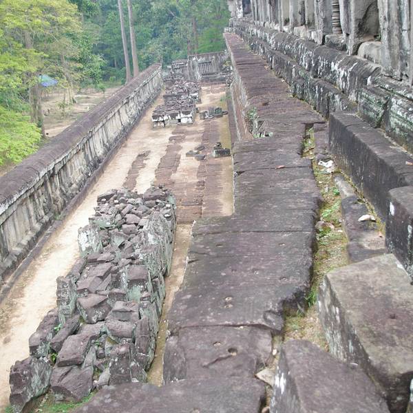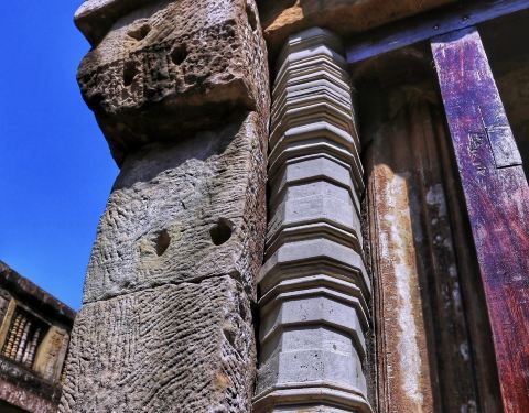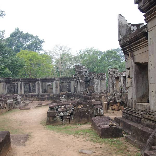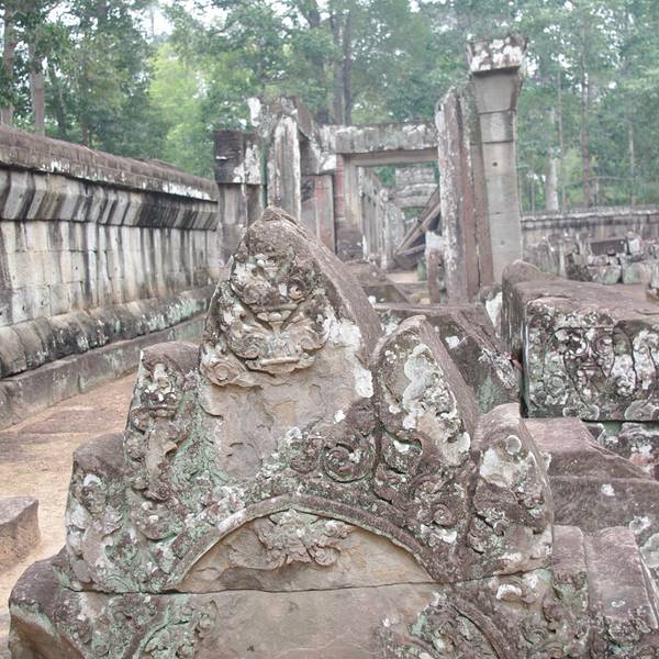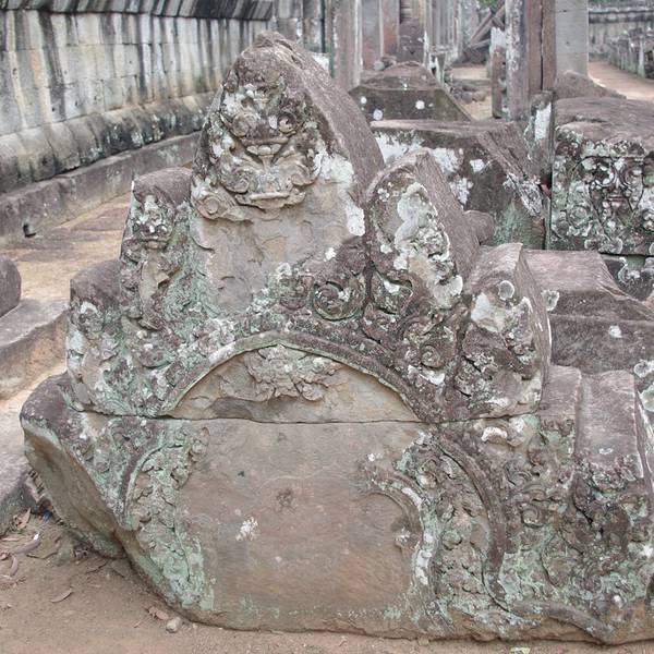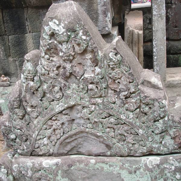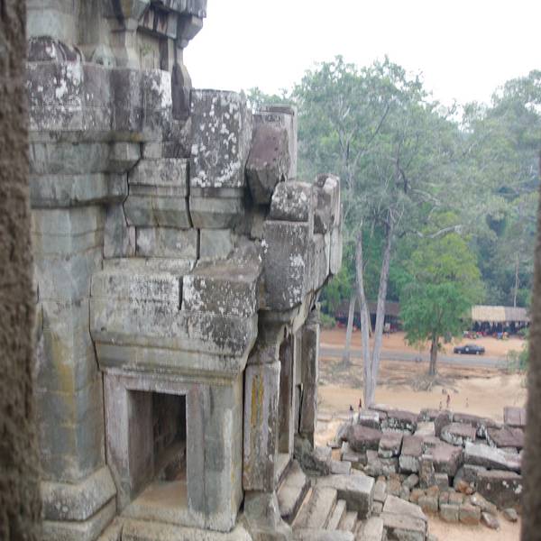 此寺建造过程中跨越两个王朝,因此四面门中仅有东面大门有雕刻,此处可轻松了解到所有吴哥窟遗址群的建筑都是先将石头堆积再行雕刻,证明当时建筑技术为“先堆后雕”。 展开