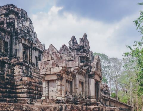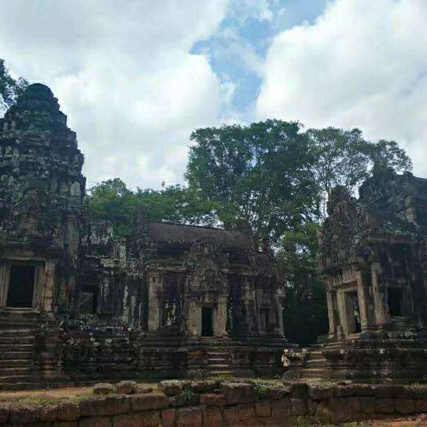 茶胶寺位于通王城以东、塔普伦寺西北,这座金刚宝座塔式的庙宇是一座全砂岩石建筑,但并未建造完成,因此也是吴哥古迹中的一座几乎没有雕刻的寺庙。全寺由坚硬的长条青石整齐地堆积起三层平台,顶端耸立着五个莲花形高塔,与吴哥寺类似。这些寺塔虽然已经堆砌完成,但尚未雕刻。据说在建造时寺塔曾被雷劈中,国王认为那是神明在警告他,若继续建造会不吉利。游玩指南从通王城的胜利门出来,往东不到1公里就是茶胶寺。进入寺庙有东南西北四个入口,东边为正门,门前有条长长的引道,架在护城河上,只是河已干涸。寺庙外有两层回廊,分别围绕着两层平台。从东塔门进去便是一层平台,南北两侧各有一间长厅。接着往前走,穿过塔门就是二层平台,这里的回廊开有窗户,光线可以照到里面。在二层回廊内也有两间长厅,还有两座藏经阁。再往前到第三层平台,眼前是巨大的金字塔形庙山,上面有五座寺塔。庙山的四面都有台阶,东面较为平缓,而西面比较陡峭。攀登长长的台阶方能上到顶端,还请储存好体力。在五座寺塔中,中间的那座较为高大,距离地面高约50米。塔身上的石块虽然没有任何雕刻过的痕迹,看起来十分质朴,但你可以由此了解吴哥古迹的建造工艺:先用石块筑起整座建筑,再在墙壁表面雕刻佛像、浮雕。站在茶胶寺的顶端,周围是一望无际的绿林,天气晴朗时可以一览通王城的全貌,还能远眺荔枝山,感觉非常不错。
