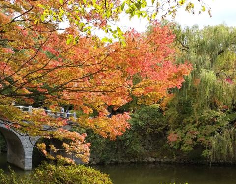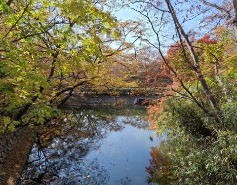 雖然說寺廟,但沿路美景美不勝收,湖景搭配倒影的楓葉,隨便拍拍都是美照。選對季節,還有櫻花可看呢