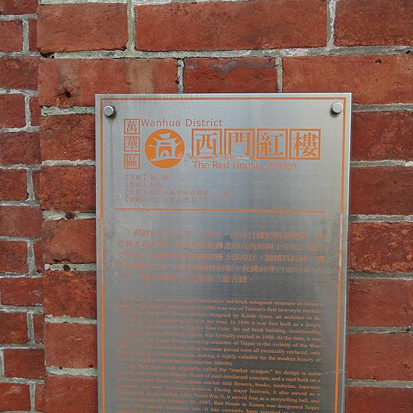 西门红楼最初是做为台湾第一座公营市场,砖八角墙楼及八卦造型的市场入口,在当时都是相当前卫的造型西门红楼最初是做为台湾第一座公营市场,砖八角墙楼及八卦造型的市场入口,在当时都是相当前卫的造型。之前重新翻修,不久前重新开放。里面现在就是文创区,有不少台创品牌好物。