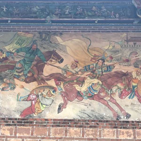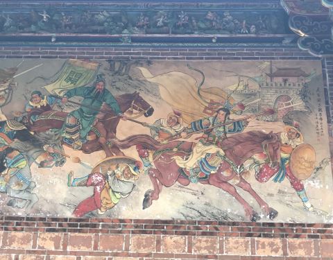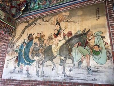 庙堂的壁画是上画的是历史故事,三英战吕布、徐母骂曹等等。庙中还设有图书馆。