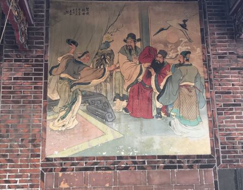 庙堂的壁画是上画的是历史故事,三英战...这个庙据说是台北的三大庙之一。供奉的主神是一位神医,被闽、台称为“保生大帝”。