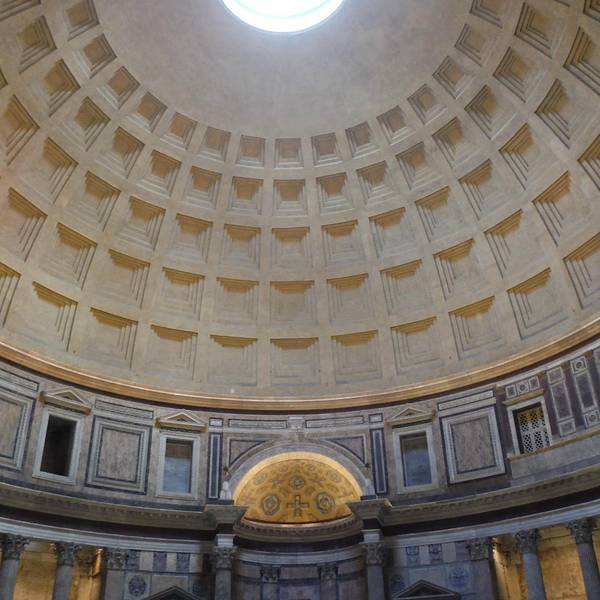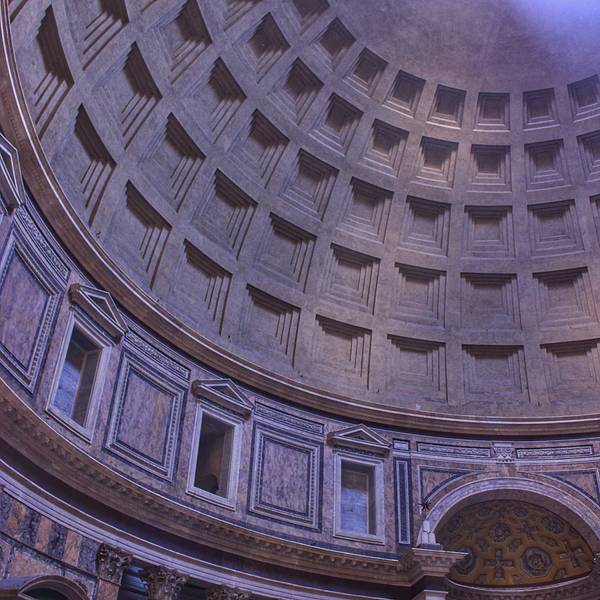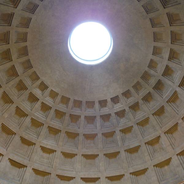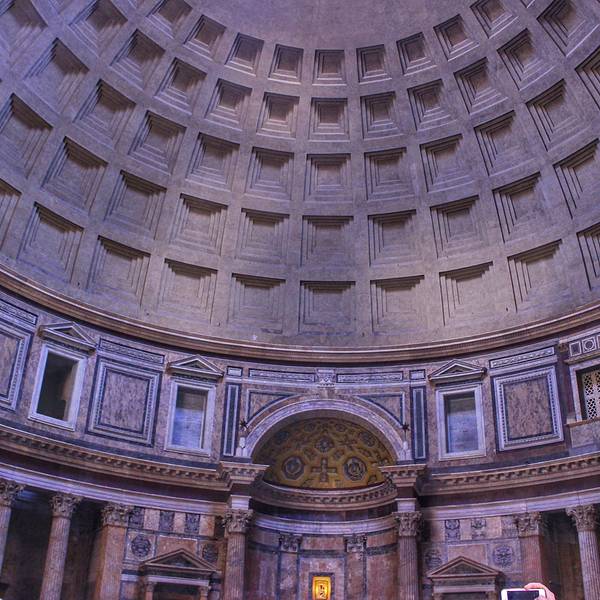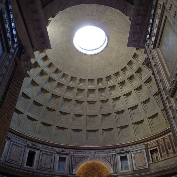 万神殿主体为大型圆柱体,有着相同的长度和宽度,地面与穹顶是同样43米直径的圆形设计。空旷的内部构造没有任何一根柱子的支撑,圆柱形的建筑构造让内殿有着浩大神秘的空间感,整座殿堂唯一的光源来自于大型圆顶中8.9米的镂空,对于圆顶进行了5排28格的划分,分散圆顶沉重,阳光错落有致地散入殿内,另庙宇显得神圣不可侵犯。墙体与穹顶皆使用火山灰与混凝土浇筑,坚不可摧,至今万神殿的穹顶仍然是世界上最大的无钢筋混凝土圆顶。