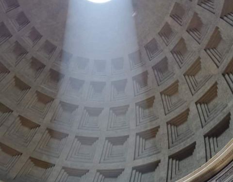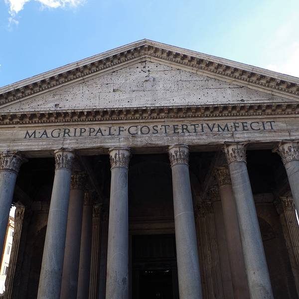 万神殿位于意大利罗马市中心,是阿格里帕在公元前29年产生构想,历时5年修建完成,为纪念奥古斯都打败安东尼和埃及艳后,用以供奉奥林匹亚上诸神。但如今我们看到的万神殿仅有外部的长方形门廊和16根科林斯式花岗岩圆柱是来自于公元前的遗迹,其余主体建筑皆是由哈德良于公元114年建造。万神殿作为罗马时期最杰出的艺术建筑,在布局与空间上都有着的巧夺天工的设计。