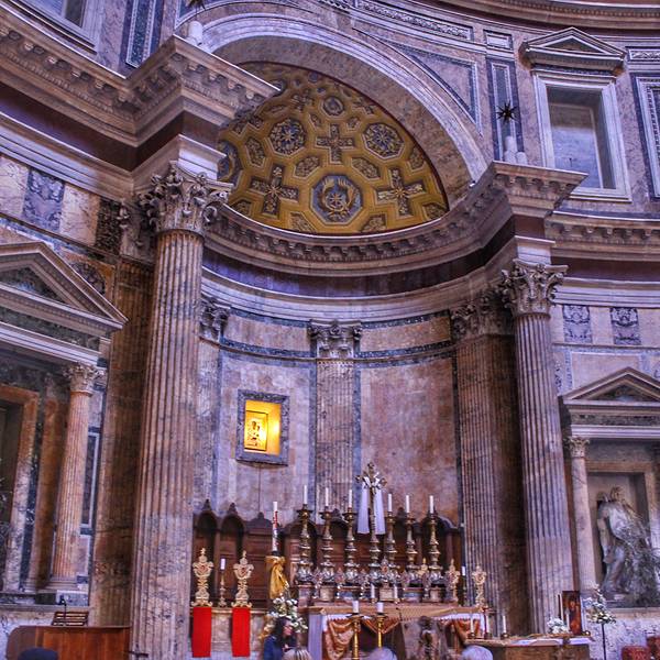 万神殿供奉有七座壁龛,用于供奉战神、朱利奥.凯撒等神明,内部墙面的设计接近于黄金分割,完美诠释古代几何与建筑艺术的巧妙融合。外廊16根罗马柱,均由花岗岩与大理石雕刻,高12.5米,直径为1.43米,精致的雕工与均衡的布局衬托万神殿的恢弘气势。正对殿前的方碑喷泉,原为万神殿的一部分。