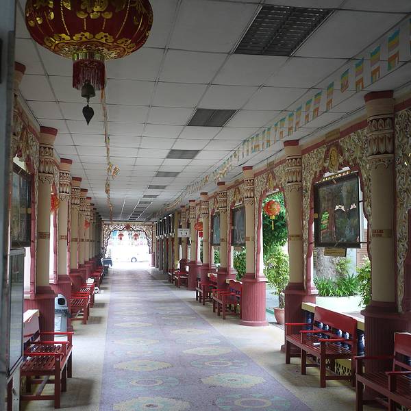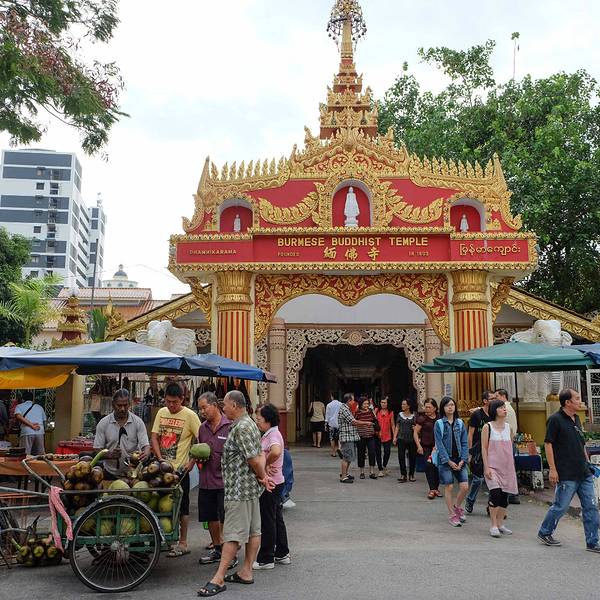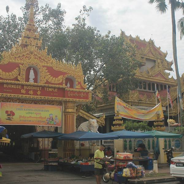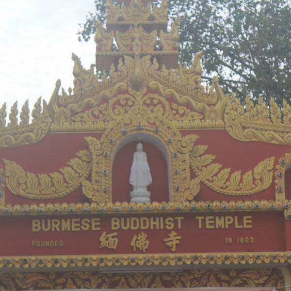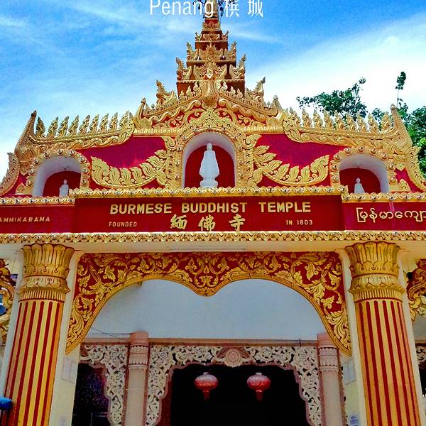 缅甸寺(Dhammikarama Burmese Temple)是马来西亚历史最悠久的 南传佛教寺庙,缅族佛教徒称为“大众拜佛寺”。据寺内碑文记载,该寺始 建于 1803 年 8 月 1 日,寺的建筑风格为地地道道的缅寺形式,寺塔一体, 上半部是四方锥形塔,下半部为方形建筑,与印度著名的菩提伽耶大塔 式样相近。从大门通往大殿的走廊上头两侧挂了三十幅关于佛陀的油画。 此外,庙里有一尊高 27 尺的高佛陀肃立佛像,据说从缅甸船运过来