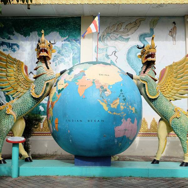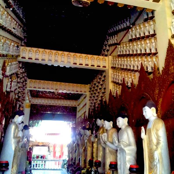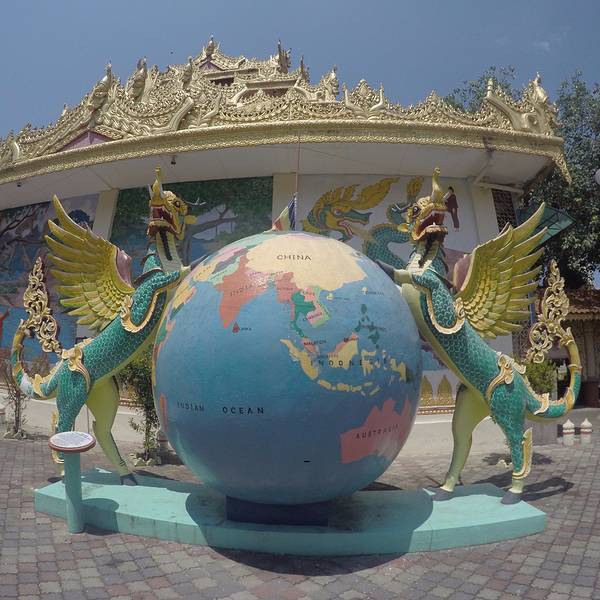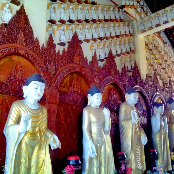 缅佛寺始建于1800年,座落在卧佛寺的正对面,顾名思义,是根据缅甸佛寺风格而设计的。寺内大殿中是一尊金碧辉煌的直立佛像,外有一对拥有鹿角、象鼻、马蹄、龙身、鹰翅的怪兽(Panchaluba),它的双脚踏在地球仪上,象征着保护地球。据说只要把双手放在地球仪上,心中默念渴望到达的任何国家,愿望就一定会实现。