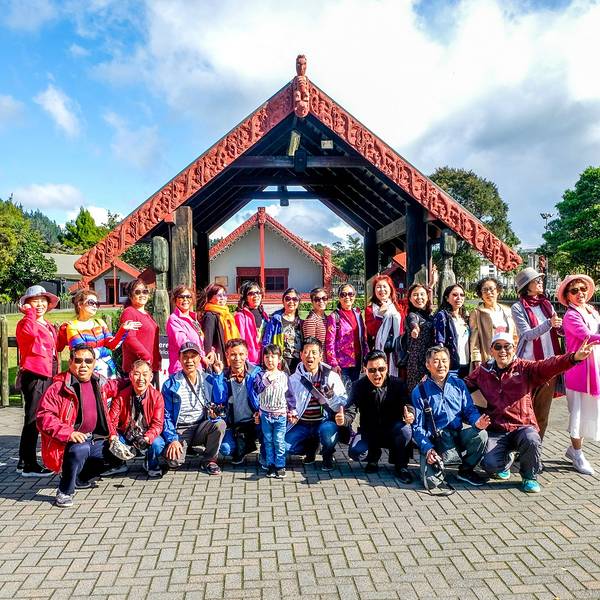 罗托鲁阿(Rotorua)是新西兰著名的观光城市,毛利族历史文化的荟萃之地。毛利文化村合影留念