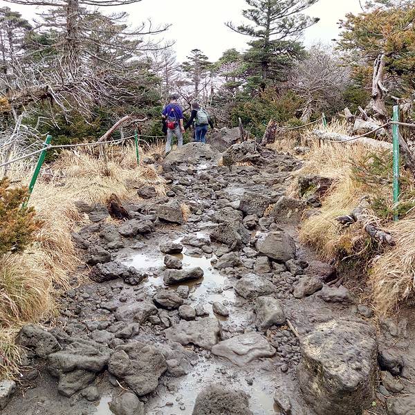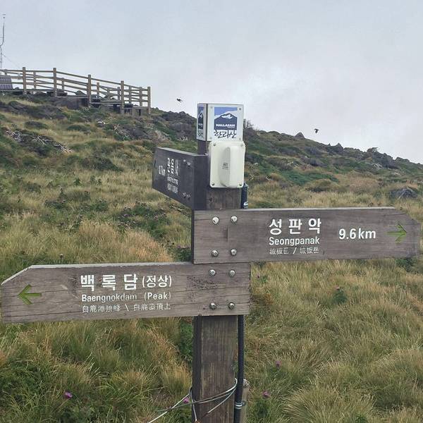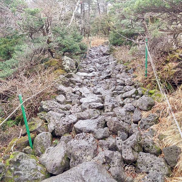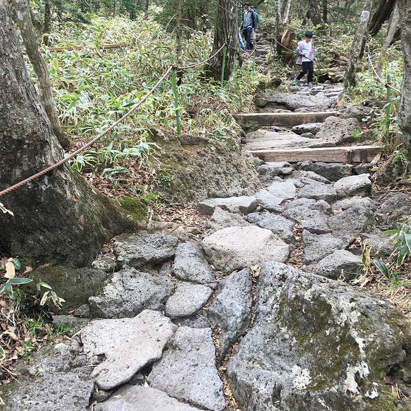 先说交通,如果从济州市到汉拿山的城板岳登山口,需要到济州市外巴士总站乘782路公交车,有一站就叫做城板岳,之前很多的攻略里提到780路,但其实现在已经改为了782路,在巴士总站是找不到780路的,782路车次比较多,基本十几到二十分钟一趟。路上用时不到一个小时,下车便可看到登山入口。汉拿山是不需要门票的,直接爬就可以了,在入口处有一个卫生间,建议提前解决一下,因为从山脚到山顶的途中只有两个卫生间,甚至连山顶都没有。城板岳登山路线长度约9.6公里,坡度较缓,大致可以分为三个阶段,第一阶段难度最低,约往上越难爬,从上面的提示牌中可以看出,首先越往上的坡度相对越大,其次路况非常不好,开始还有一些比较平整的道路,但到了上边就是很多岩石堆积成的毫无规律的石块路,走起来非常困难,如下图所示。鉴于这样的条件,有几点特别中肯的建议,首先就是一定要穿质量比较好的登山鞋,不要把这里当成国内的一些名山,穿着帆布鞋就来了,而且一定要是鞋底比较厚实的登山鞋,那些石头会非常膈脚,有的路段每走一步都很困难。其次,建议有条件的话最好带着登山杖,这样会更安全一些,上下山都会用到。我们在登山途中看到韩国人基本都会拿着登山杖,显然爬起来比我们更轻松一些。因为汉拿山的天气阴晴不定,时而就会下起小雨来,时而就露出了太阳,所以一定要带着雨衣,一定是雨衣,不是雨伞,雨伞是用不上的。而整个途中也不会有任何商贩兜售这些商品,所以不要试图在爬山途中购买。城板岳线整个途中有两处休息点,第一处位于登山第一阶段,设施比较简单,只有一个卫生间和一个可供休整的房间,没有管理人员,也只能坐下来喝点自带的水或者吃一点东西。另外全程是没有任何垃圾箱的,及时在休息点或者山顶都没有任何可以扔垃圾的地方,全部垃圾都需要带下山去,所以随身带上一个塑料袋也是比较必要的。第二处休息点是位于第二阶段与第三阶段之间的“杜鹃花田”,要想登顶,必须要在中午12点之前到达这里,否则是不会再让你继续登山的,因为那样不能保证你在日落之前下山,会有危险。在杜鹃花田休息站提供的设施则相对齐全,除了卫生间,还有一个小卖部,提供饮用水,方便面和巧克力等,价格非常公道,记得泡面应该是1500一碗,会帮你倒上开水;在半山腰上来碗韩式泡面,热乎乎的非常美味,最后连汤都全喝了。另外买泡面的时候会给一个小袋子,让登山者把泡面盒带回山下。过了杜鹃花田就是最难爬的一段了,风景也和刚才有些不同,植被不同,视野也会更开阔些。虽然最后一段路最难爬,但有了希望就更有动力了,最终我们用了4个半小时登顶白鹿潭!登顶后大家都会与白鹿潭的石碑合影,而且都是很有秩序的在无人管理的情况下排好队,轮流过去拍照。但是山顶没有卫生间,也没有可供休息吃饭的地方,所有人都是席地而坐。在山顶拍拍照片,喝点水,吃了点随身带的面包,做了短暂休息就准备下山了,因为呆的时间长了真的会有一点冷,这里的温度会比山脚下低。起初我们曾打算从观音寺线路下山,但后来说观音寺线因为有落石等原因封闭了,所以依旧从城板岳线原路返回。