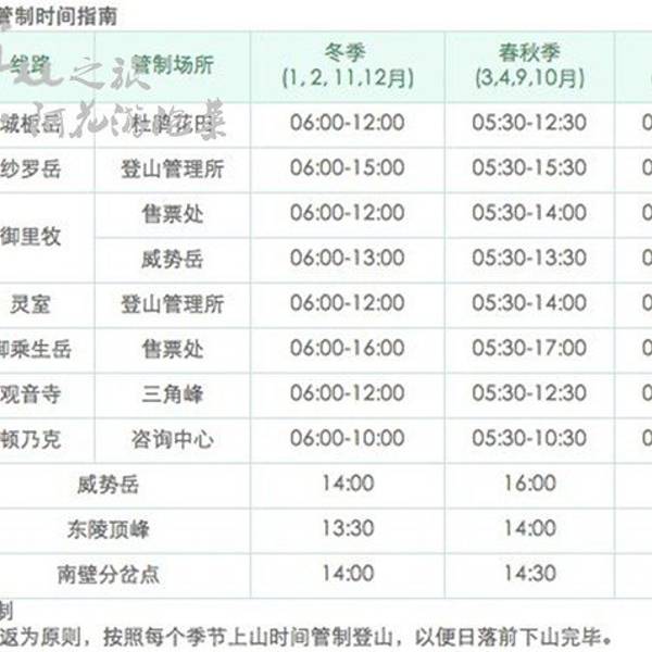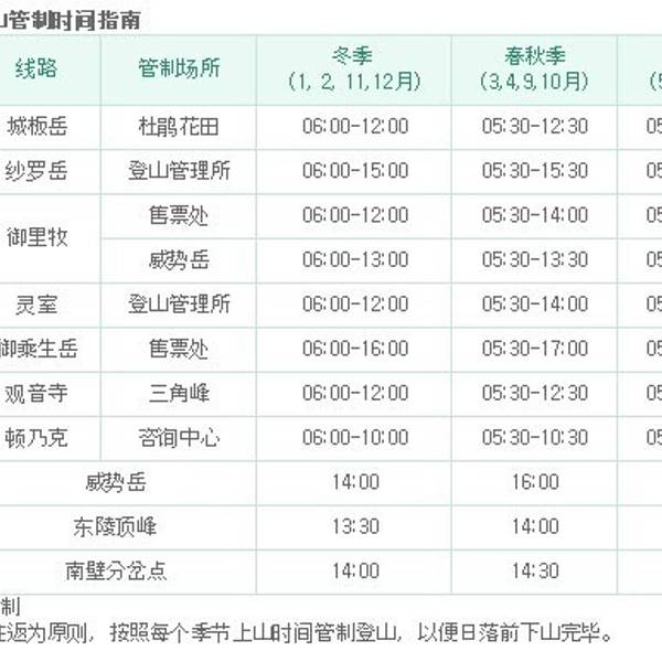 1/1-2/29(冬季) 06:00-14:00;3/1-4/30(春秋季) 05:30-14:30;5/1-8/31(夏季) 05:00-15:00;9/1-10/31(春秋季) 05:30-14:30;11/1-12/31(冬季) 06:00-14:00