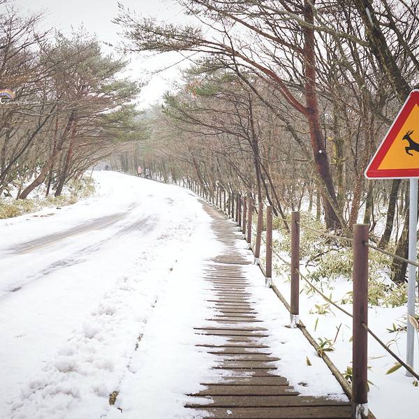路上时不时地还会遇到小心野鹿的标志,wuli姗姗一本正经地问我这鹿是麋鹿还是梅花鹿,地理与自然盲表示无言以对。冬日里来汉拿山hiking的基本都是韩国本地人,很少有中国游客选择这样冷冰冰的天气来看雪景。