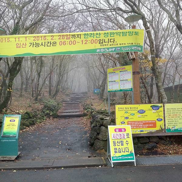 汉拿山位于济州岛的中部,海拔为1950米,它不仅仅是济州岛的最高山,也是整个韩国境内的最高山峰。作为休眠期的火山,其周围的自然风光优美,早早地就被列为了世界自然遗产。攀登汉拿山是不需要门票的,登山步道总共6条,而目前开放的步道主要有4条。城板岳路线和观音寺路线可以登顶,灵室路线和御里牧路线则为半程路线。作为想爬山又想偷懒的代表,我和姗姗选择的当然是灵室路线了。