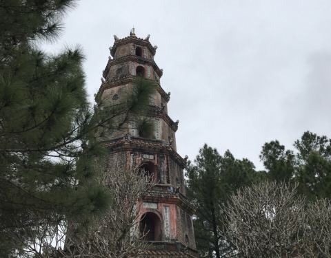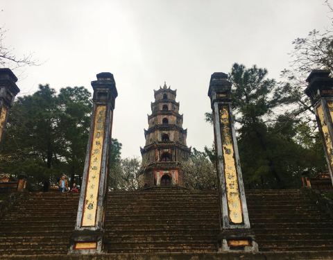 天姥寺是顺化的一个免费景点。离市区不太远,可以打车也可以乘船过来天姥寺是顺化的一个免费景点。离市区不太远,可以打车也可以乘船过来。寺庙就在香江江畔。很多漂亮的游船停在江边,当地人不停地揽客,有兴趣乘船游香江也不是不错的选项。拾级而上,先看到七层高的福缘塔,每一...天姥寺是顺化的一个免费景点。离市区不太远,可以打车也可以乘船过来。寺庙就在香江江畔。很多漂亮的游船停在江边,当地人不停地揽客,有兴趣乘船游香江也不是不错的选项。拾级而上,先看到七层高的福缘塔,每一层都有一幅汉字对联,旁边是一座历史悠久的古钟楼。几座大殿和普通的寺庙没什么两样,和国内的大寺相比不值一提,但绿树成荫,环境很好,院子里的娑罗树开着红色的花,很奇异的感觉,引得西方游客纷纷拍照。站在高处眺望长长的香江,可以抒发一下情怀。 展开