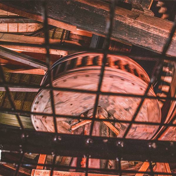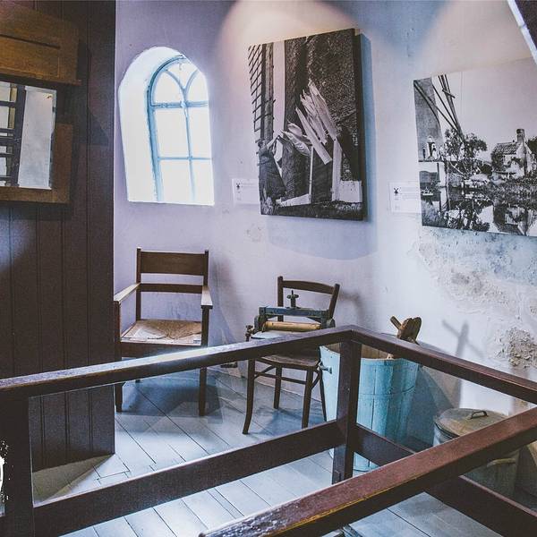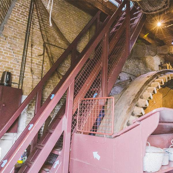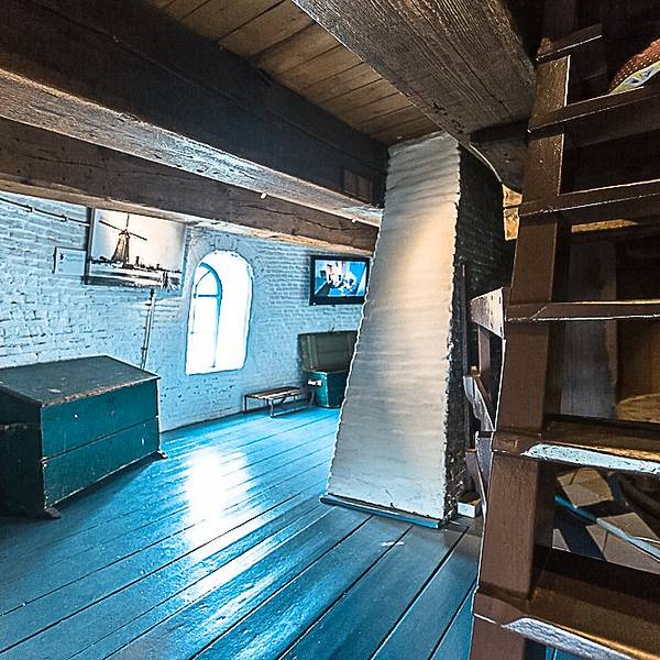 风车在顶部转动,风车里面可以看到内部的轮轴在转动。旧时的荷兰人利用风车为生活带来很大的便利,在风车的二层,墙壁上有挂着关于以前荷兰人利用风车洗衣服等生活用途的照片。通过二层的小窗户,可以看到外面的田野,也能看到风车的叶片一转一转的,室内的光线随着叶片的转动一明一暗。荷兰人通过自然的力量风力使得风车转动,叶片旋转时,随着一楼的木轮旋转将室外水渠的水抽到附近的水塘里,实现灌溉的便利。