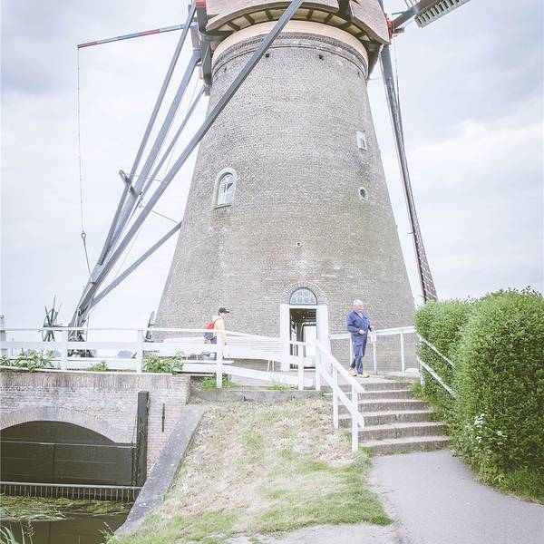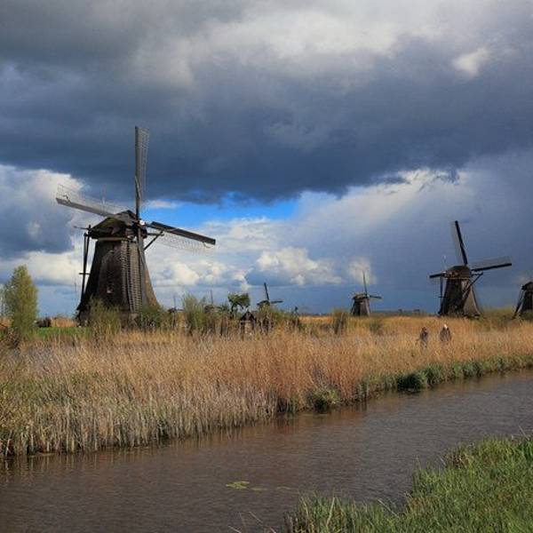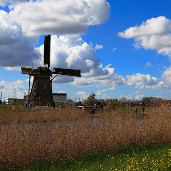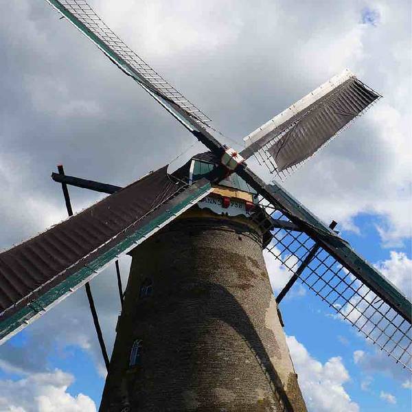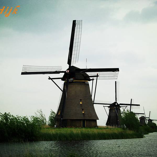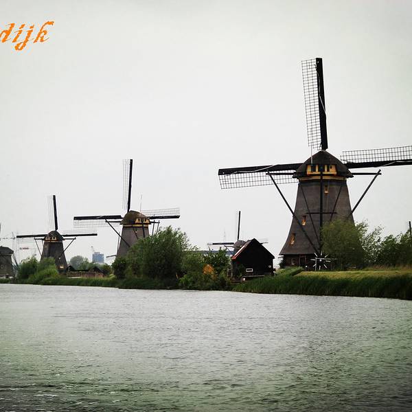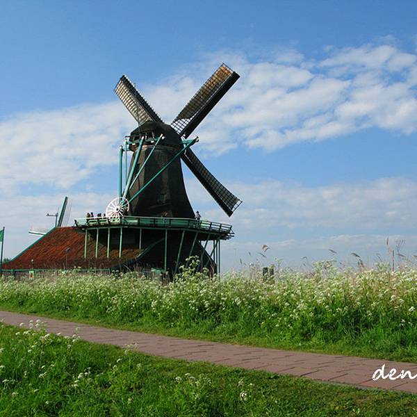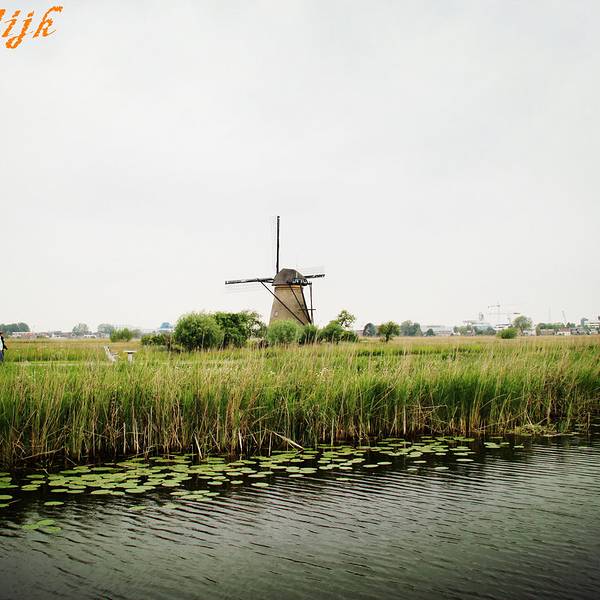 秋日里,艳阳下,走在蓝天白云为背景的旷野中,听着风车转动的嘎吱声,或迎面而来三三两两的行人,或骑着自行车向远方而去的游客。围海造田开垦出的新土地,道路两旁潺潺的流水经由风车流入莱克河(Lek),随后注入北海。站在风车下,仰视这巨人,挥舞着十字形的手臂,速度与力量的结合,凝重而霸气。看着磨坊主踏上粗大的木质操控转盘,踩着尾端的支架,一下一下的升高,听着巨大的风叶加速旋转在耳边,有力的转动引发风的呼啸。