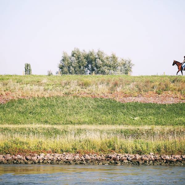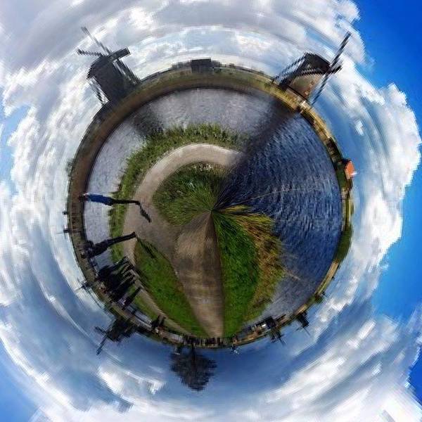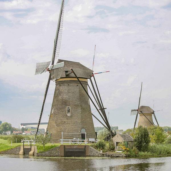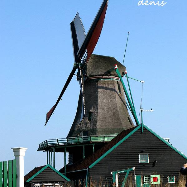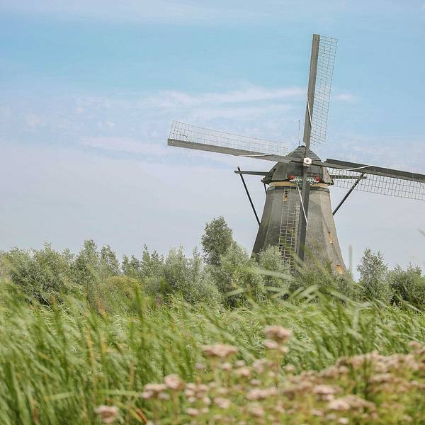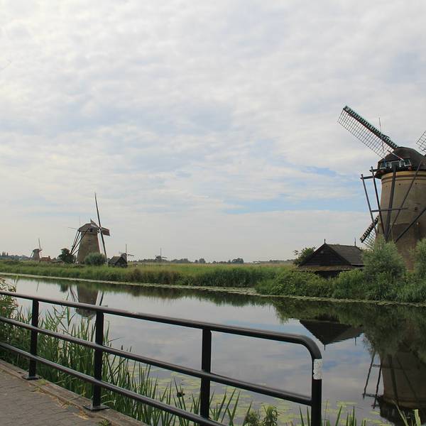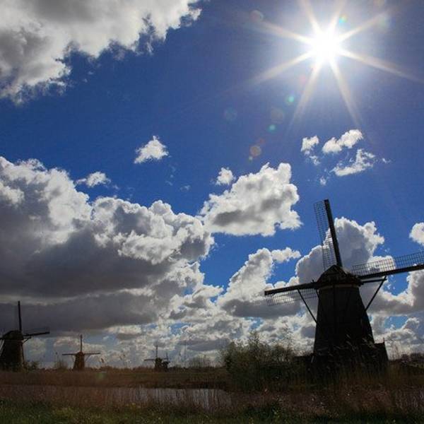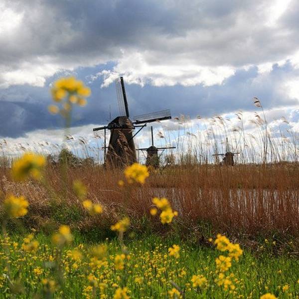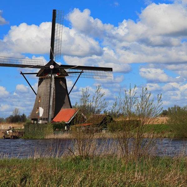 秋日里,艳阳下,走在蓝天白云为背景的旷野中,听着风车转动的嘎吱声,或迎面而来三三两两的行人,或骑着自行车向远方而去的游客。围海造田开垦出的新土地,道路两旁潺潺的流水经由风车流入莱克河(Lek),随后注入北海。站在风车下,仰视这巨人,挥舞着十字形的手臂,速度与力量的结合,凝重而霸气。看着磨坊主踏上粗大的木质操控转盘,踩着尾端的支架,一下一下的升高,听着巨大的风叶加速旋转在耳边,有力的转动引发风的呼啸。