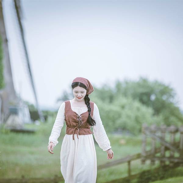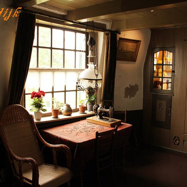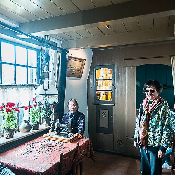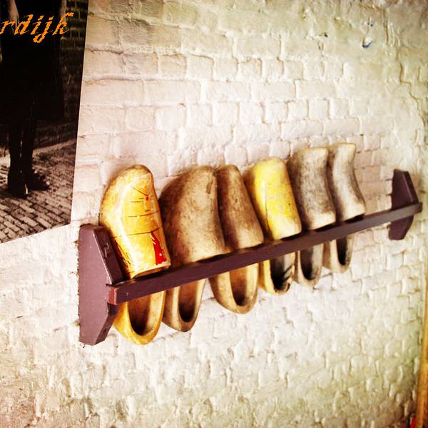 三层的顶部是不能上去的,只能站在楼梯看着它是如何运作的,估计顶层是整座风车的核心,所以围着不让人近距离参观。在一楼还有一个小房间,非常生活化,外面有一些厨具像是曾经有人住在这里一样。走进房间一看,原来这是一个居住的地方,像小小的家,我这才知道原来风车里面可以主人,相当于家一样。房间里面生活用品非常齐全,最里面有一张床,还有壁炉可以烧火,桌子上有一台手摇缝纫机,我就好像那个年代的人,摇着缝纫机看着窗外的风车叶不停转动。从大风车出来以后觉得这个地方非常适合拍照,便在这里拍了一组关于风车的写真。最有趣的是风车前的黄色大木靴。荷兰三宝中木靴必须占据一席,现在木靴虽然已经很少人会穿了,慢慢衍生为纪念手工艺品,可以用来作为花坛花瓶插花使用。