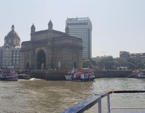 二、客轮通常分为上下两层,请注意,当你踏上客轮的那一刻建议赶紧上二层,不久后客轮出发,你在顶层二层可以以印度门为背景合影,要尽快,不多时间印度门就渐行渐远了。
