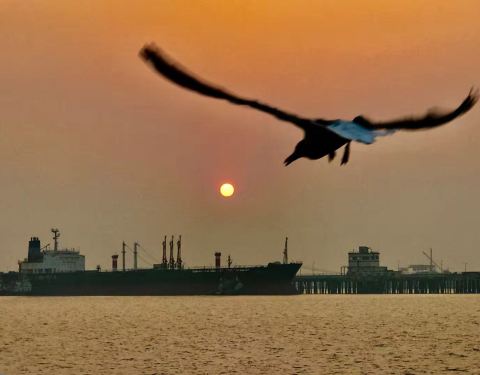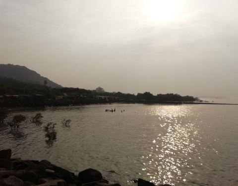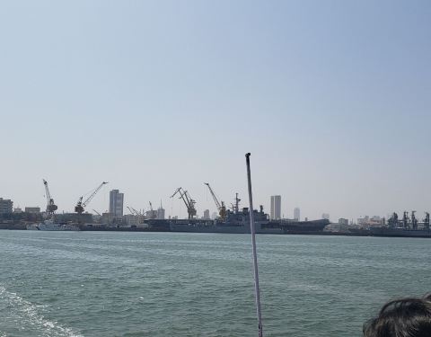三、行驶中这里的海水很脏,除了远处的舰艇没有什么景色,到达象岛码头需要步行二十多分钟,或者选乘这里的小火车,有点类似景区的电瓶车,慢悠悠地把游客载到象岛景区下方。建议游览后选乘小火车,这时光线柔和,海天一色,很棒!