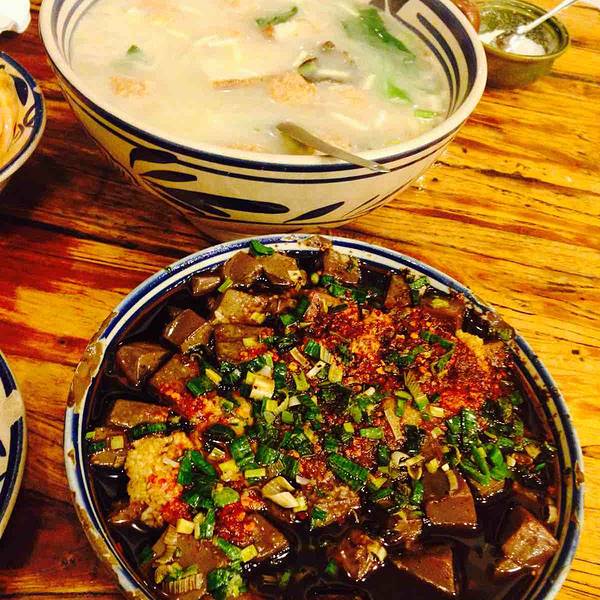 辣子蒜羊血必吃的,又辣又香素菜拼盘白菜酸甜咸香,特色鸡蛋醪糟很纯正的酸甜味