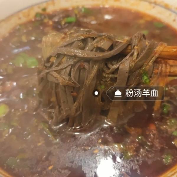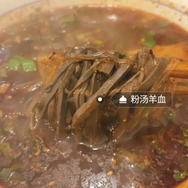 羊血不光是第一吃,而且第一次听说有这种吃法,除了鸭血,鸡血,猪血又吃过羊血了,而且是切成细细条状的,很嫩很好吃,没有什么特别的味道,汤汁看着很多红油,其实一点都不辣,把浮油—撇,汤的味道也挺不错的。里面还有挺多粉丝,煮的很软弹入味。