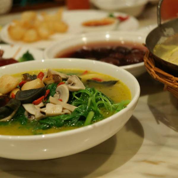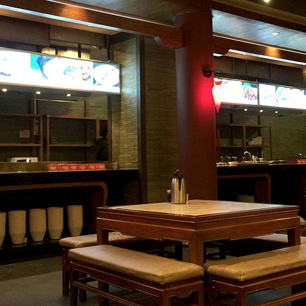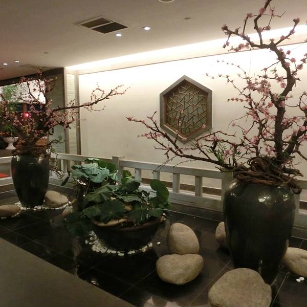 虽说“酒香不怕巷子深”,但谁喜欢饭前团团转地找地儿呢?这家排挡处在交通枢纽地区的一幢商务大楼内,友人在火车站接了我们,10分钟就自驾抵达,楼下有停车;电梯直达5楼,门打开的瞬间,扑面而来的古风景致即刻征服了我们马不停蹄的步调。红灯笼、长条凳,总让我想起“放下佩剑,吼来小二,来两斤卤牛肉”的气势,而小桥流水、桃花嫣红又该是轻移莲步,走向芬芳的景象。一家餐厅的环境也让人浮想联翩,算不算“酒不醉人人自醉”呢?