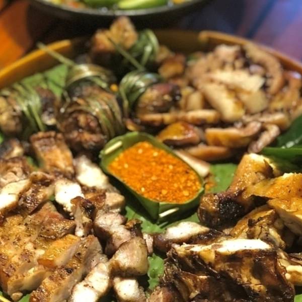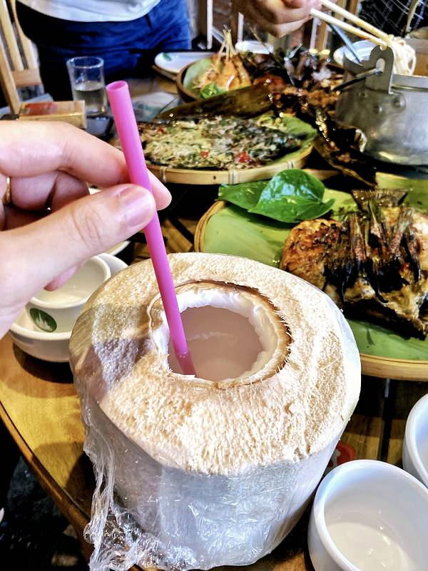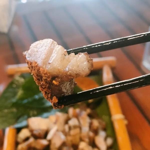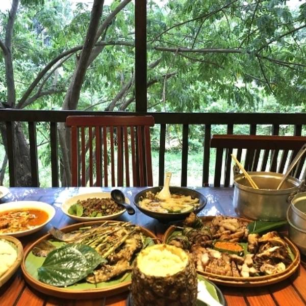 下机后来了红象牙餐厅解决午饭,餐厅是类似吊角楼,架空来建,装修比较原始,农家饭风格。菠萝饭米粒晶莹剔透,酸甜可口,软糯非常,烤五花肉肉质紧实,有肉类的油脂香气,分量超足,沾着干辣椒粉吃,别有风味。本...下机后来了红象牙餐厅解决午饭,餐厅是类似吊角楼,架空来建,装修比较原始,农家饭风格。菠萝饭米粒晶莹剔透,酸甜可口,软糯非常,烤五花肉肉质紧实,有肉类的油脂香气,分量超足,沾着干辣椒粉吃,别有风味。本着对泰国罗非鱼的念念不忘,旅途中一路上我都在找罗非鱼的美食,最后一个菜也是点了包烧罗非鱼,鱼身用棕叶包裹,各种菜碎香料覆盖鱼身,打开叶子就能闻到香料和叶的清香,味道丰富但是鱼肉本身的味道并没有很凸显。103的费用,吃的还是很满意的。