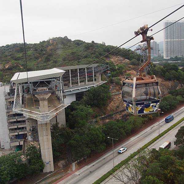 于高铁香港西九龙站按指示牌经行人天桥前往九龙站,抵达九龙站后搭乘东涌线直达东涌港铁站。由东涌港铁站B出口只需步行约5分钟便可到达东涌缆车站。