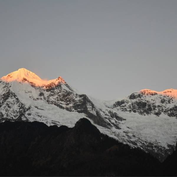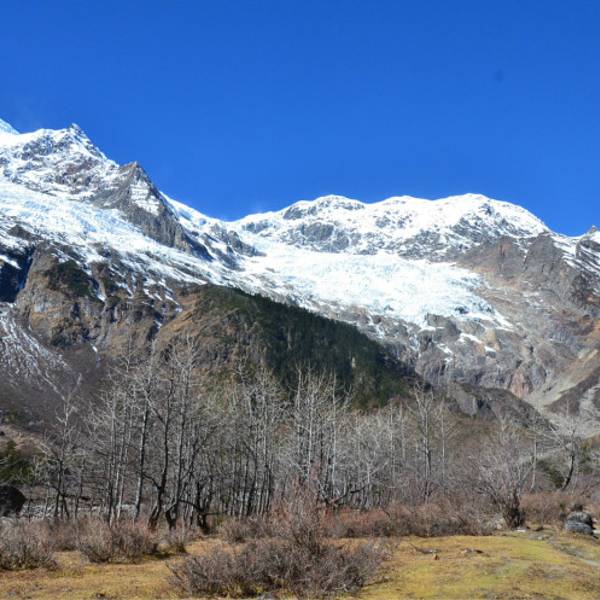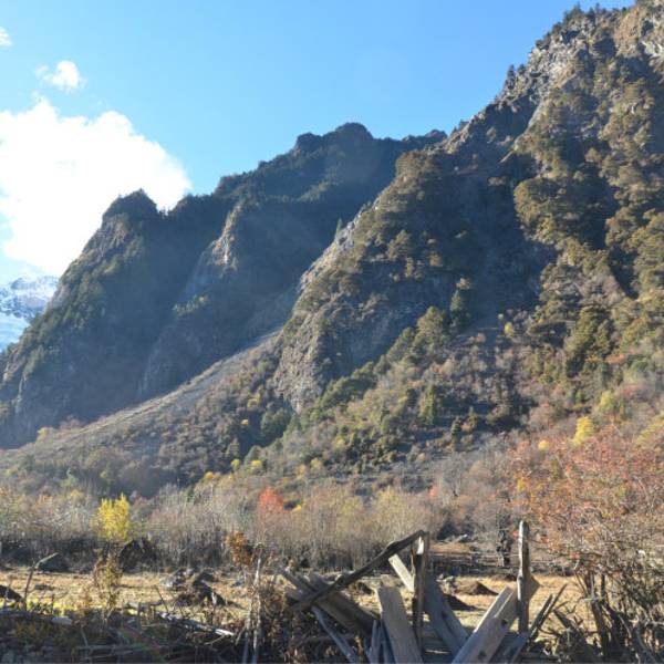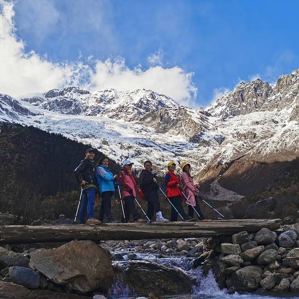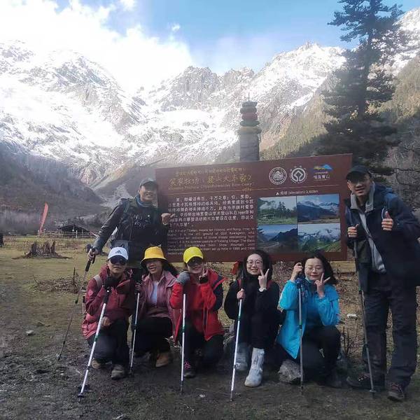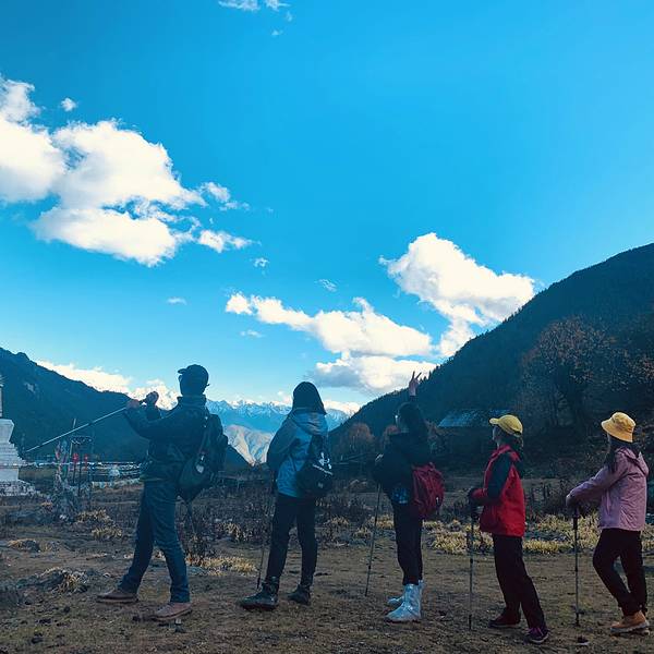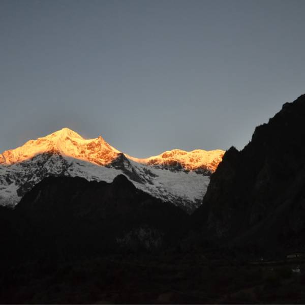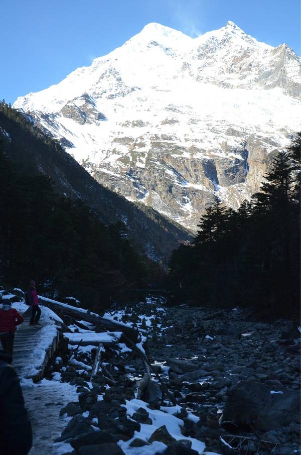 窗外就是大大的雪山,我们八点要出发,七点多就必须起床,所以这个日照金顶看不看已经由不得我们选择,因为一睁眼就能看到,近在咫尺的感觉。因为前一天都是上坡路为多,脚意外地没有冷痛。今天的行程就是冰湖,也就是翻过一座山到雪山脚下,来回24公里的山路。和我们同来的另外一队人马已经零零散散地,六人剩下3人和我们一同出发,另外两女生打算在旅馆休息,还有一大叔准备骑着毛驴进山去,后于我们出发。