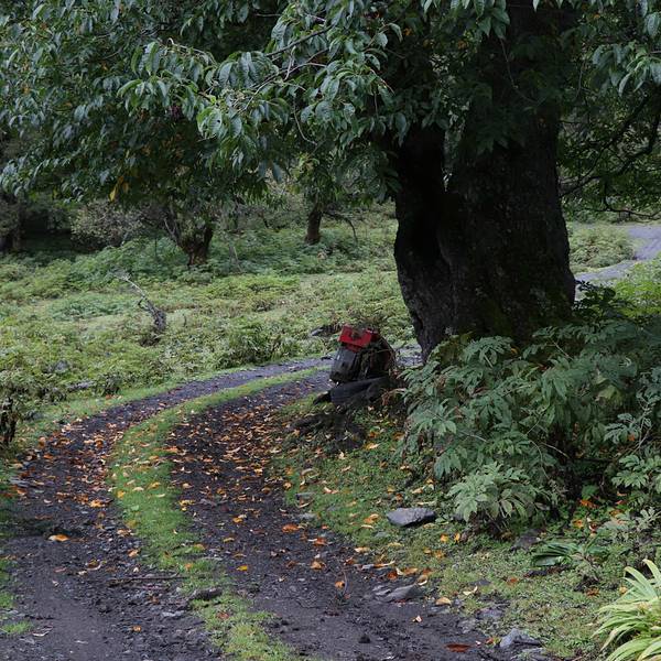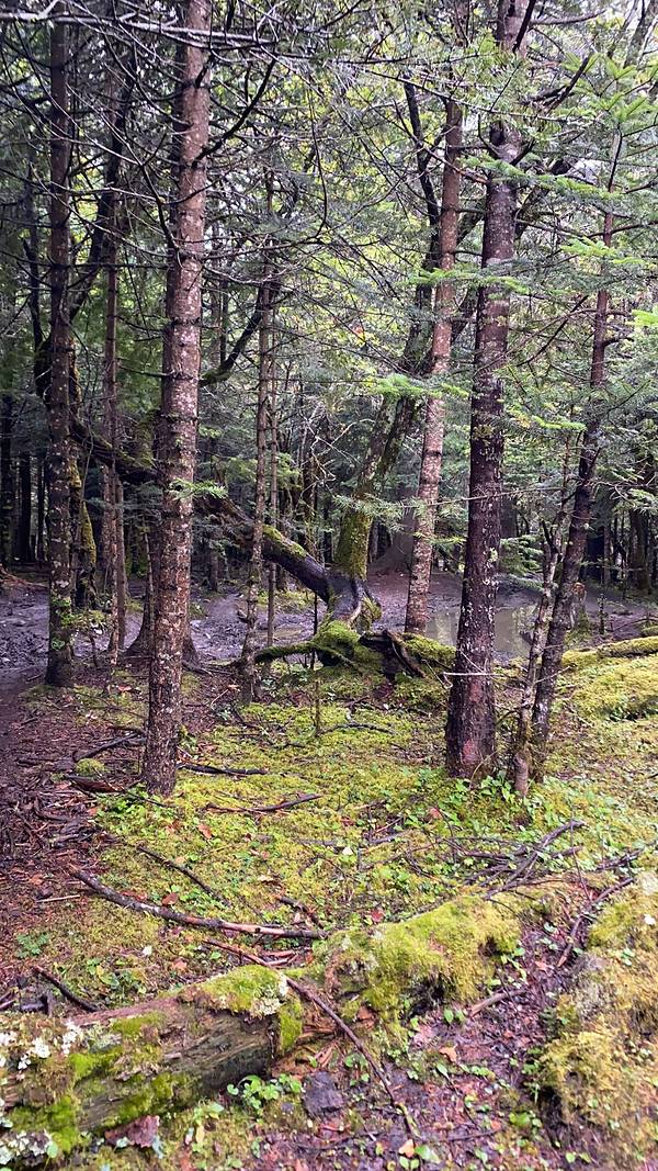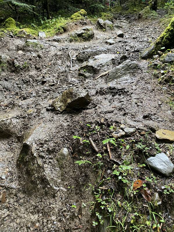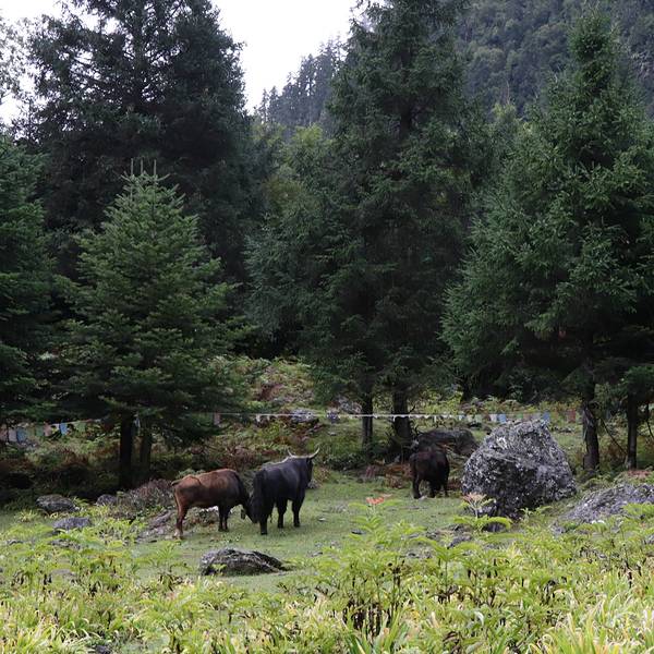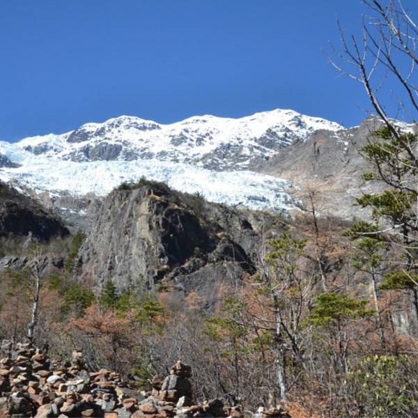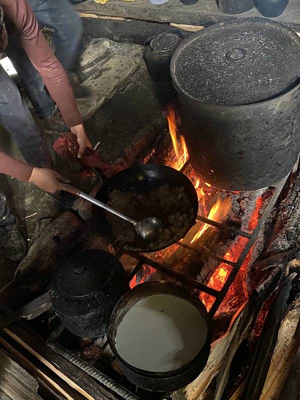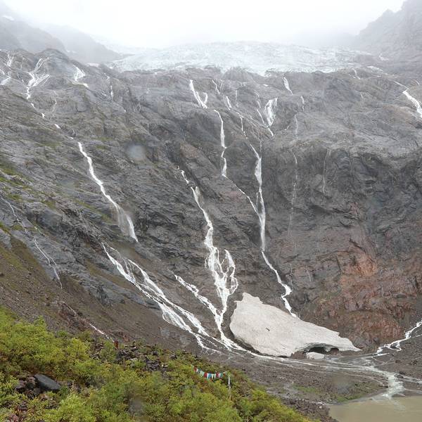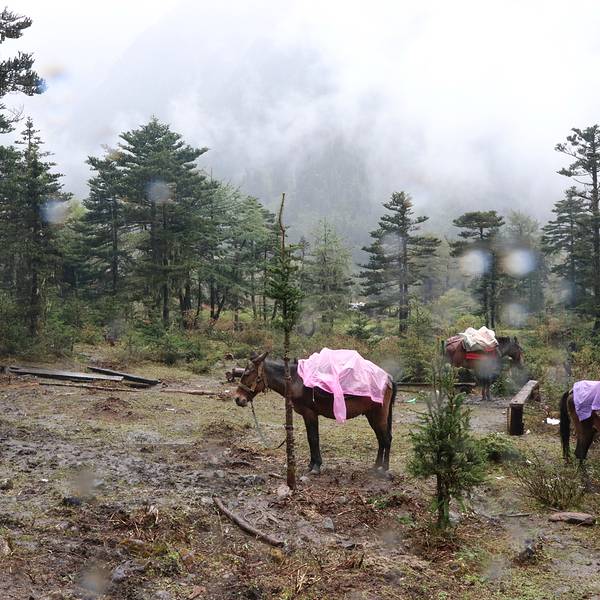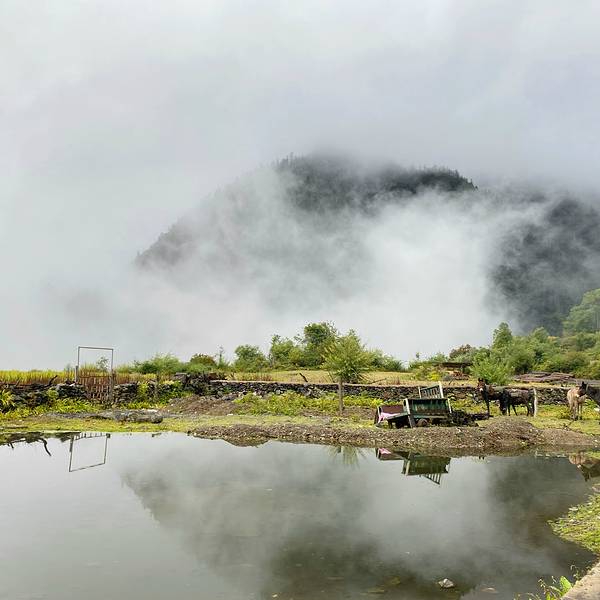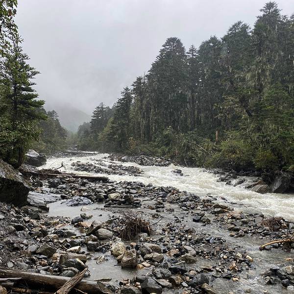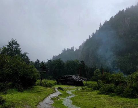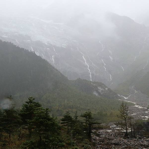 重走此路,早上的风景与昨日大不相同,仙气缭绕如水墨一般,不禁惹人住足停留欣赏。雨一直没有停过,山路难行,向导估计全程要11个小时,人总说独自一人在森林里迷路很可怕,实践出真知,切身体会了一把。没什么路,很多是马踩出来的,尤其大本营以上,就是未开发区。行至半路有条大河,沿河道而行,鞋已经全湿了。走了4个小时,中午12:30到达笑农中日联合大本营,听这个名字感觉应该全是帐篷和人,或是有设立的砖房,原来是木头搭的牛棚。小雨变成大雨,棚外的马一动不动的淋着,如果有人愿意骑马下山,它们就要驮着人走那条泥石路下去。见到两匹下山的马,饿了在垃圾里捡纸壳吃。总有人说来世做牛做马,它们哪有那么容易。大本营有个小卖部,也有热呼的炒饭和牦牛奶,卫生就不要求了,不干不净吃了没病。上山的时候没背吃的,想想要补充体力要了一份,还是个肉炒饭(50/碗)。这里没信号,只能使现金。站在大本营已经可以看见雪山了,虽然雨大雾大看不鲜明,但能看见也算没白爬。从大本营再往上走一个半小时就能到达冰湖,这里也是部分人的止步点,其实到达这里我早就体力不支了,全凭毅力往上走。同车的姑娘想拉我骑马下山,没想到我非要上去,用她们对我的看法就是:这人第一天势必坐车进村,吃饭这不吃那不行的模样,今天是吃了激素来的吗?不仅干一盒牦牛炒饭,居然还要上冰湖?其实当时我脑子里全是那句能让人持之以恒的话:来都来了。