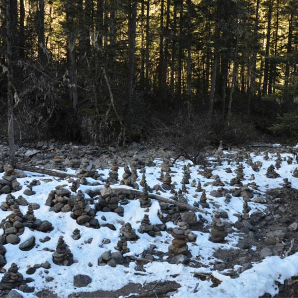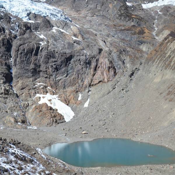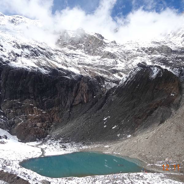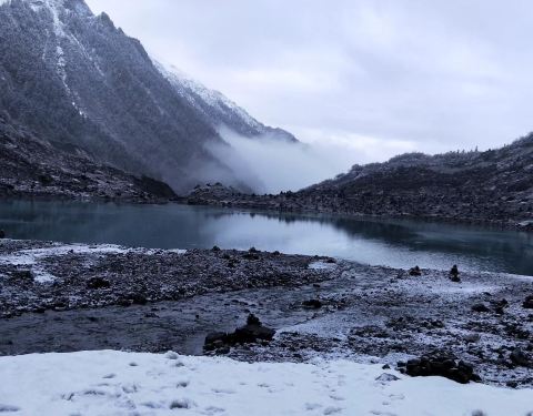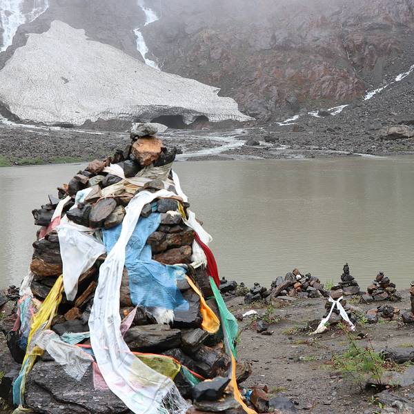 感谢队友的生拉硬拽把我赶了上去,让我看到了冰湖的真容。也许天晴时它是蓝色的吧。山上的雪水融化汇集成湖水,冰的扎手。冰湖周围全是马尼堆,后边那块白的是个山洞大雪山在后边,雾太大看不清楚3点的时候被催着下山,我们的行程已经比预计的晚了,山上黑的早,如果天黑前未能下山就危险了。