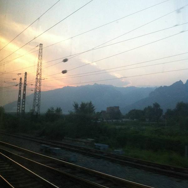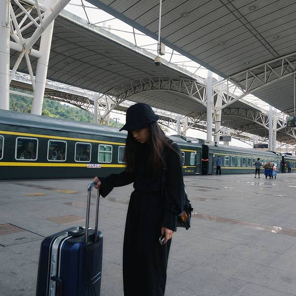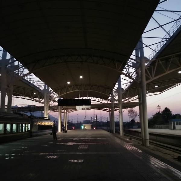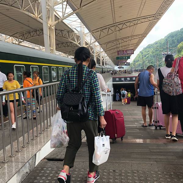 - 拖着沉重的行李离开火车站。站台边上的黄昏,还能看见远方点缀着通往天门的登山缆车