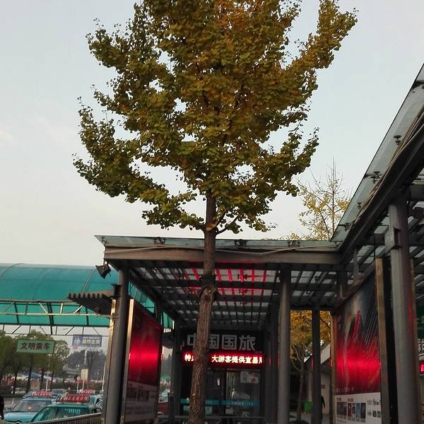 出门在外,防人之心不可无,面对不明来由的人,虽然我内心是善良的,但我从来都是一副不友好的样子,没有为什么,只是想表达:不要惹我!在售票大厅里,熬至七点半后,便根据导游的指引,去到火车站隔壁的一个停车场等候旅游大巴车8:00来接我。出站,发现金黄色的银杏树后,我又开始小兴奋了!