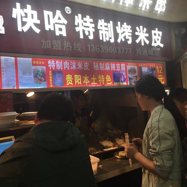 坑爹的单位,因为上午还要上班,所以只能下午出发了。两点的高铁直达贵阳北,四个小时的路程,途径多山的广西之前一直担心下雨,看着外面的天气放心多了已到达,差不多六点出来往西广场走,顺着指示去往公交站,...坑爹的单位,因为上午还要上班,所以只能下午出发了。两点的高铁直达贵阳北,四个小时的路程,途径多山的广西之前一直担心下雨,看着外面的天气放心多了已到达,差不多六点出来往西广场走,顺着指示去往公交站,有直达火车站的公交放下行旅,根据老板指路来到小吃街,开吃罗!人好多。夜色中,一排排整齐的红顶小店,卖着各种不同的特色小吃,每一家都让人垂涎三尺,可惜胃口不够。曾经在桂林吃过了特好吃的烤猪蹄,一直念念不忘,这次当然少不了,虽然比不上桂林的,依然美味!蛋包饭~我们的主食最长队伍的烤米皮档口。问:很好吃吗?答:不知道,看着人家排我也排。我……这就是米皮,好吧,吃不出特别的感觉看着样子好想吃用面皮包完这些就是传说中的丝娃娃。真的是太多家店了,当然也有很多看上去就普通到不想吃。吃饱喝足溜达回客栈~
