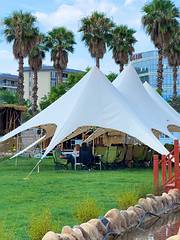一走进营地就被狠狠治愈!超大开阔草坪,高大的棕榈树错落有致,蓝天白云当背景,随手一拍都是度假感大片✨ 白色巨型天幕下整齐摆放着露营桌椅,旁边还有一排温馨的小帐篷,不管是朋友聚会、家庭出游还是公司团建,都能找到超舒服的位置。