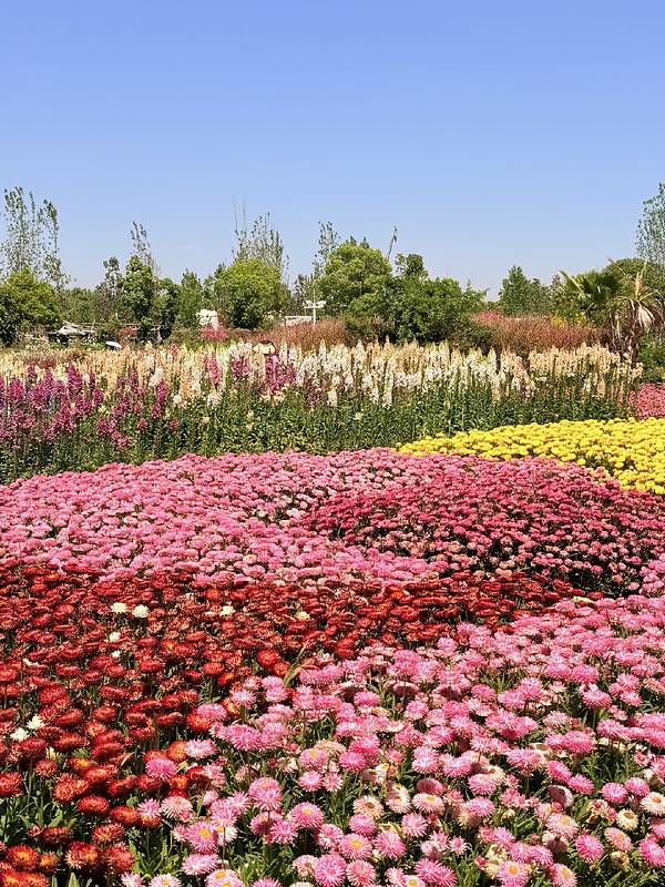 百亩花田层层叠叠,明黄麦秆菊、粉白毛地黄、蓝白大花飞燕草交织成片,色彩温柔又浓烈,像被打翻的调色盘🎨。搭配眼前的滇池波光与远处的西山轮廓,每一帧都自带油画质感。