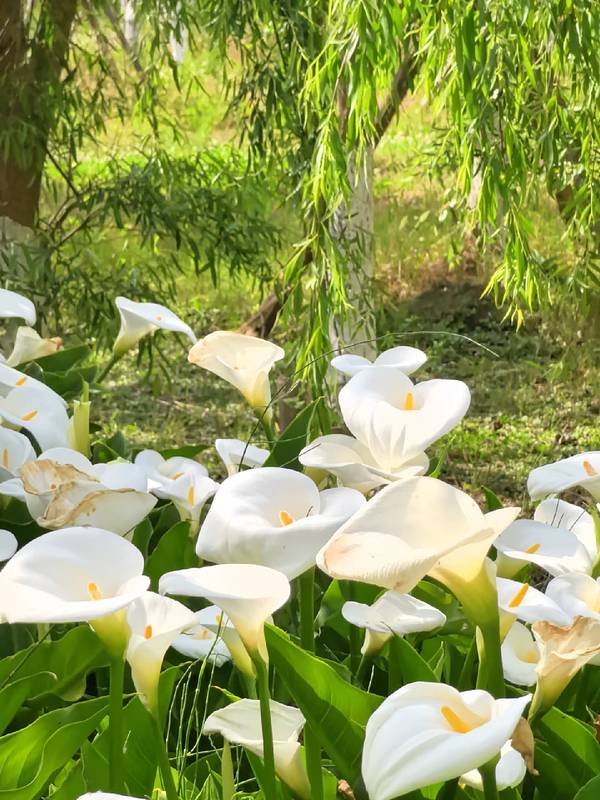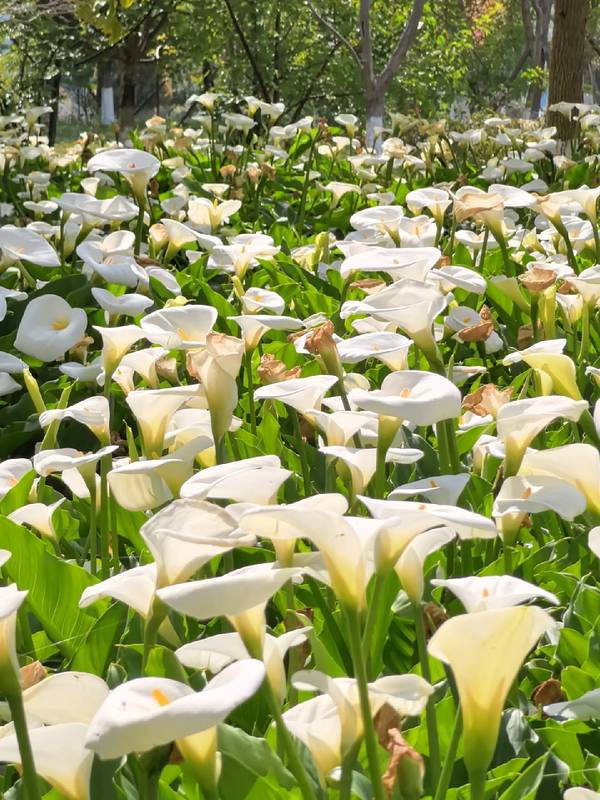 这片花海就在市区的城市公园里,不用长途奔波,就能邂逅春日限定美景。每年春天一到,上万株马蹄莲尽数绽放,放眼望去全是纯净的奶白色,花朵形似小喇叭,搭配嫩黄花蕊,衬着翠绿的叶片,清新又治愈。花海被茂密树木环绕,阳光透过枝叶缝隙洒落,在花瓣上形成斑驳光影,微风拂过,白色花浪轻轻摇曳,氛围感直接拉满,漫步其中,整个人都被温柔的春日气息包裹,治愈感爆棚。