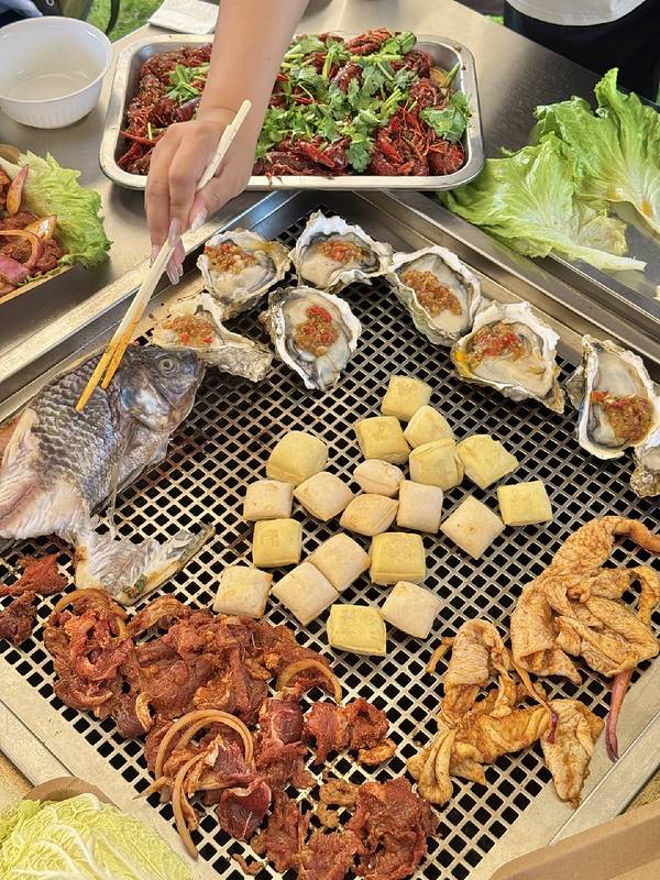 ✅ 特色烤肉:腌制好的牛肉、五花肉在烤盘上滋滋冒油,肉质鲜嫩不柴,裹上生菜吃,香到停不下来!