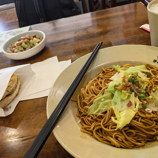 - 就近在火车站吃的早饭,李先生葱油拌面套餐+小菜(36+9)元。远处的泉城广场地标