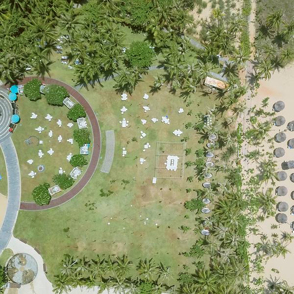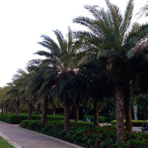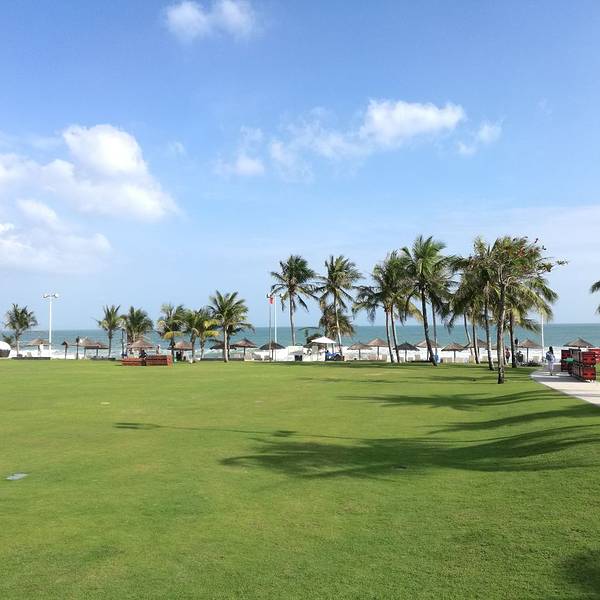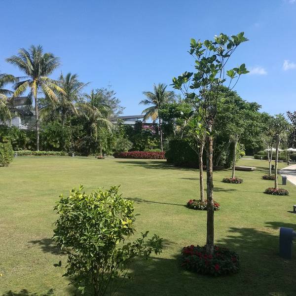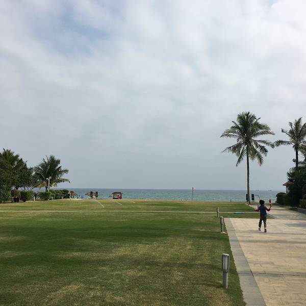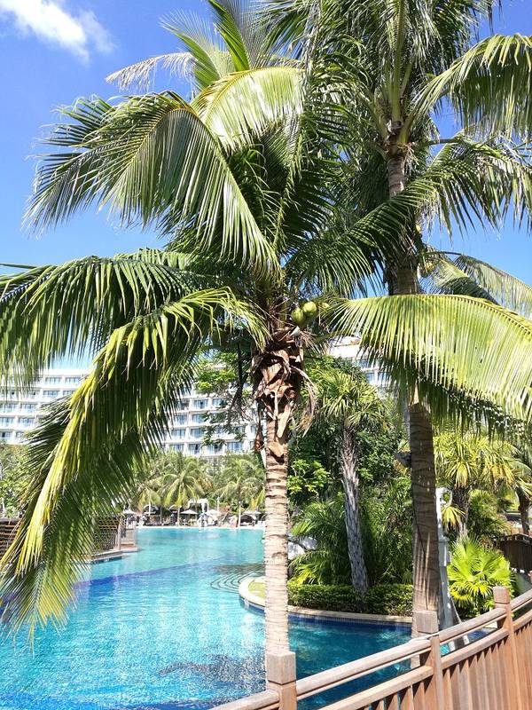 酒店去沙滩有两种途径,一是大堂坐电瓶车,也需要5分钟,二是从电梯口直接步行去海滩,也是5分钟。我们去是电瓶车,回来步行,5分钟的路程,风景很不错,沿着游泳池,一路热带植物,特别是那“未成年”椰子树,特别有味道。