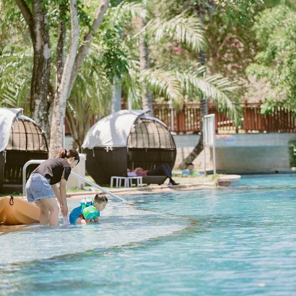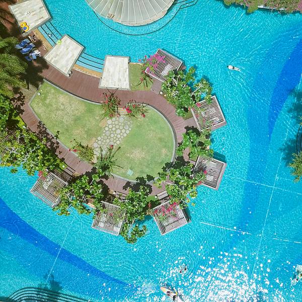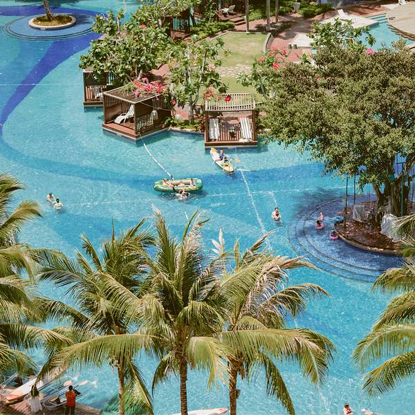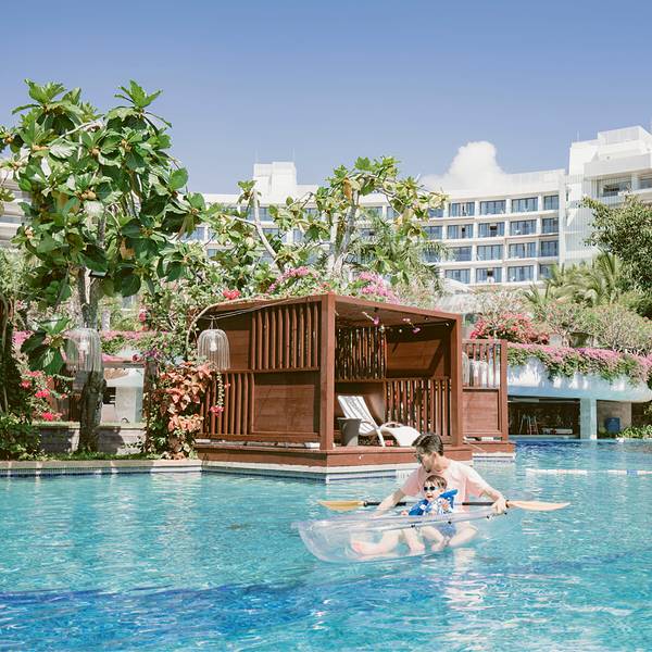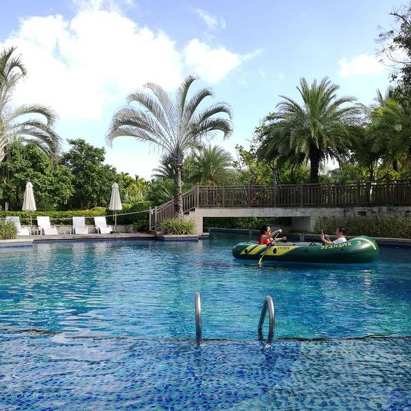 🏊🏻♂️户外泳池:这里的户外泳池算是海棠湾最有特色的,自带了超长泳道,还提供透明玻璃船🚣,平时在马代印尼拍的网红漂浮照,这里就能满足你,水不深,不会游泳也不必穿救生衣影响拍照。泳池边自带小沙滩,够娃耍上好久了。