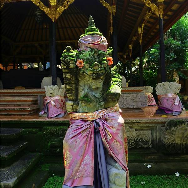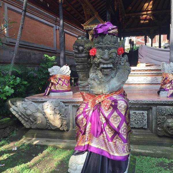 金骆驼 这里有独具特色的木雕、美丽的银器、各色的服饰及小商品巴厘岛之行第一站就是落脚于素有“巴厘岛艺术重镇”之称的乌布,到此免不了参观乌布皇宫。我们从乌布所住酒店过来,也就十几分钟车程,毕竟在乌布中心地带,基本上司机都知道,这边的道路基本是双车道,但交通秩...巴厘岛之行第一站就是落脚于素有“巴厘岛艺术重镇”之称的乌布,到此免不了参观乌布皇宫。我们从乌布所住酒店过来,也就十几分钟车程,毕竟在乌布中心地带,基本上司机都知道,这边的道路基本是双车道,但交通秩序良好,车不太多,也没见塞车。不过这里可以参观的面积真心不大,又是室外为主,如果只是走马观花,十几二十分钟就逛完了,规模不可与中国的皇宫行院同日而语,但它自有它的魅力。这栋皇宫在16世纪建成,据说是乌布王朝邀请当时著名艺术家设计而成,光是精致细腻的手工雕刻就值得欣赏。所以,有时我们会驻足观看那些已被时光消磨了一些外表的雕刻,现在虽然不复当年的风光,但由这些精美的石刻依然可以遥想当年的盛景。而且在这些斑驳的建筑中有着生机勃勃的花草树木,清雅的鸡蛋花、独具特色的竹子,点缀期间,越发让人有种时光交错的感觉。此外,入门处可见到一群可爱的小朋友在练习舞蹈,这些小姑娘年纪不大,最多就是小学生年纪,但有的却跳得相当出彩,不但手脚动作优美,连脸部表情也神彩兼备。皇宫内至今依然有王室后裔住在这里,他们和平民一样努力工作谋生。如果你想体验巴厘岛最传统的艺术文化,可以选择在晚上参观乌布皇宫,因为可以欣赏每晚皇宫院内的巴厘岛传统舞蹈表演哦。逛完乌布皇宫后可以在附近逛街购物,因为它就位于市内两条主路Jl. Monkey Forest和Jl. Raya Ubud交叉口处的繁华地带,对面就老市场。从乌布皇宫出来进入琳琅满目、熙熙攘攘的乌布市场更是有种时光交错感哦~这里有独具特色的木雕、美丽的银器、各色的服饰及小商品。我在这买的纱笼、裙子与T恤、精油香皂等,都可以讲价,因为是在巴厘岛第一站购物,也没什么参照,而且一般的开价也不会漫天要价,讲价也没太大幅度,纱笼价格比普吉岛便宜,T恤比国内热门景点便宜,但手工一般,不过图案有特色哈,总之是满载而归。 展开